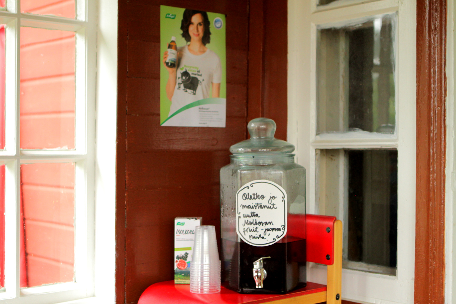 Me suomalaiset olemme ihanan tunnollista kansaa, ja vaikka olin omasta mielestäni kirjoittanut lappuun aika selvästi että juomaa saa maistaa, aika moni tuli sisälle kahvilaan ilmoittamaan että aikoo nyt ottaa lasillisen sitä Molkosania ja mitä se maksaa? No ei maksanut mitään.