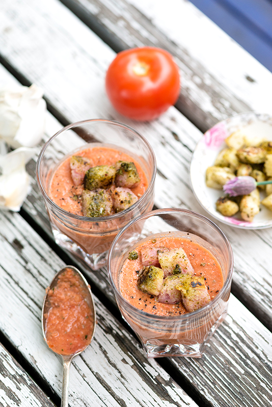Tarjoa kylmä keitto rapeiden pestokrutonkien seurana.